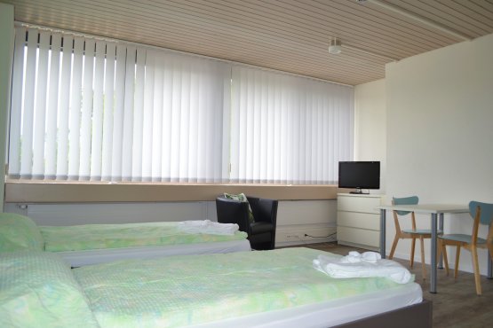 The twin bedded rooms offer space to feel comfortable and the furniture is modern. All double rooms are bright, cosy and most importantly practical for your stay. The basic equipment of each room includes a corridor bathroom (lockable) with shower, toilet, sink, hairdryer, internet access LAN/Wifi, cable TV and a safe.